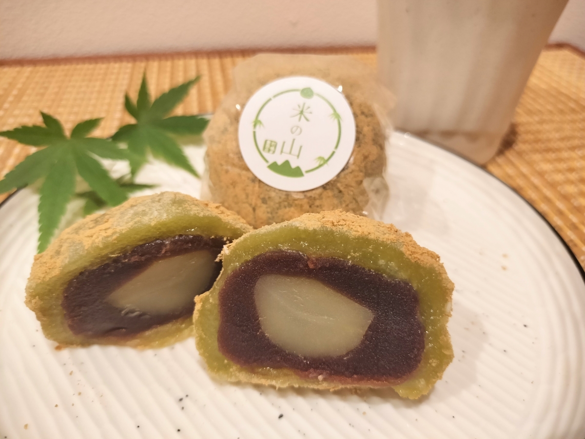 抹茶入りのやわらかな求肥で、香ばしいきな粉と、優しい甘みのこしあん、真ん中に一粒の栗をふんわりと包んでいます。口に運べば、しっとりとした求肥の食感とともに、栗の存在感がふわりと広がる、秋ならではの味わい。