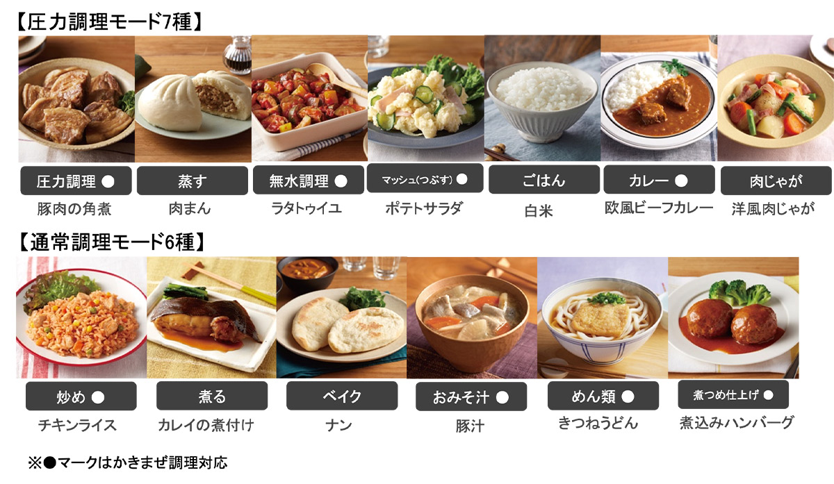 圧力調理や無水調理を始め、煮る、蒸す、炒める、マッシュ(潰す)など全13種類の調理モードを搭載し、さらにお出かけ前の準備で帰宅時にアツアツの出来たて料理が食べられる「スマート予約調理プログラム」も搭載した高級機。