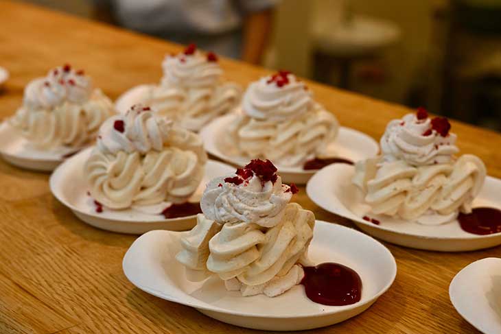 のんびりと食べていたら、さまざまなブースで品切れが続出。最後はやっぱり、スイーツを。フリーランスパティシエ・向井聡美さんのブースではサクサクのメレンゲにベリーのクリームを挟んだスイーツ、辻口さん率いる『モンサンクレール』のブースではミルフィーユが完売していましたが、梨を使ったクレープをゲット。甘い余韻に浸ると、お腹も心もすっかり満たされました。