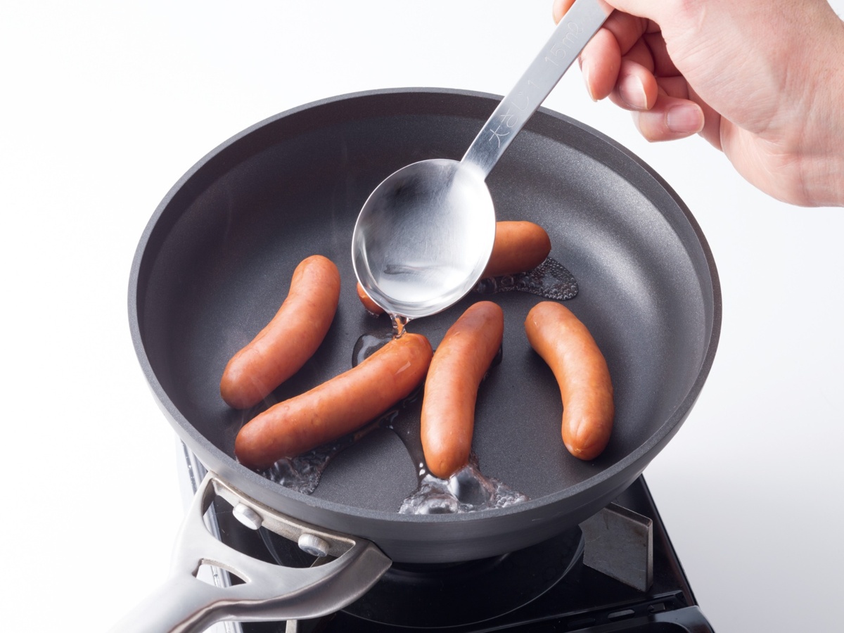 1.油はひかずに、フライパンにウインナーと大さじ1杯の水を入れ、フタをしてから火にかけます。