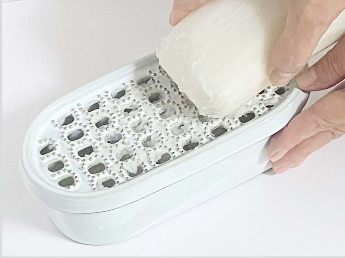 安定感のある受け皿付きで、そのまま器として食卓に出せるデザイン性もポイントが高く、大根だけでなく、長芋、生姜、玉ねぎなど様々な食材にもフィットしますので、隠し味や薬味作りにも活躍しますよ。