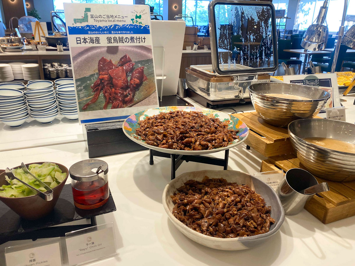 2024年4月にオールインクルーシブ型として生まれ変わった今おすすめのリゾートホテルです。朝食ビュッフェでは、富山ブラックラーメンや押し寿司、ブリ大根など富山らしい品々に加え、焼き立てパンや砺波産はちみつ、県産野菜のサラダバーなど多彩なメニューが並びます。