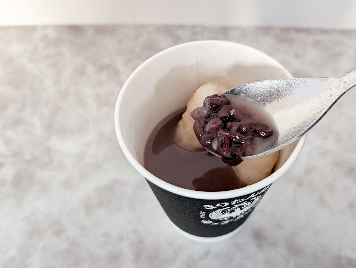 餅とは違う、お米由来の歯切れのよさがあり、もちもち感と、噛むほどにあふれる米の旨みが、小豆の甘さと絶妙にマッチ! しかも温かく、やさしい甘さが胃袋をほっこり癒してくれます。
