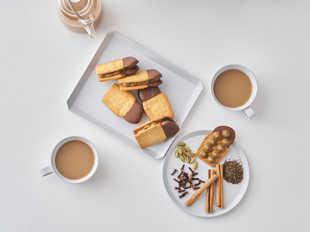 香り高いセイロン紅茶と、カルダモンやシナモンなど7種のスパイスを加えた特製アングレーズソースにホイップバターを合わせ、香ばしいビスケットでサンドしています。