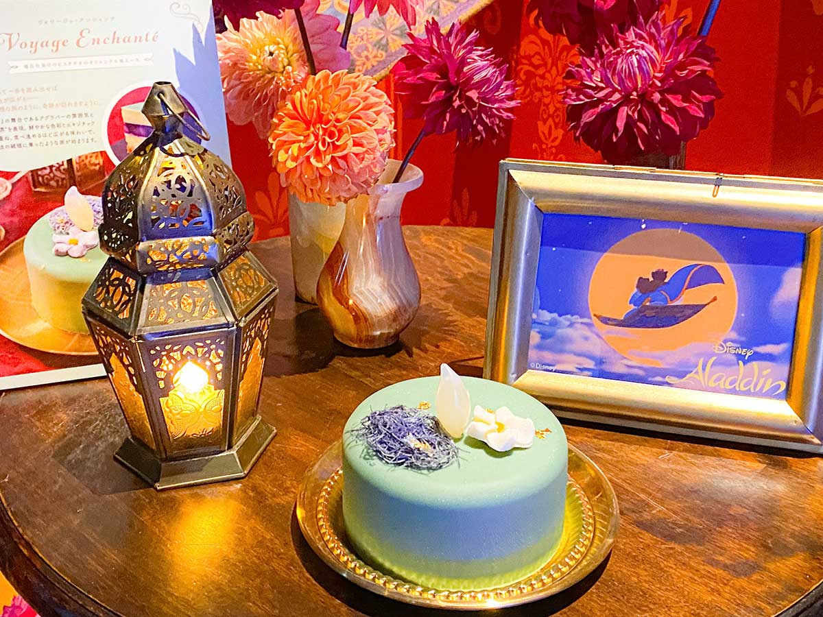 最後は『アラジン』の舞台を思わせるエキゾチックな香りと色彩のケーキを。エキゾチックな香りと色彩で、ありのままの自分を受け入れたアラジンの物語を写し込んでいます。
