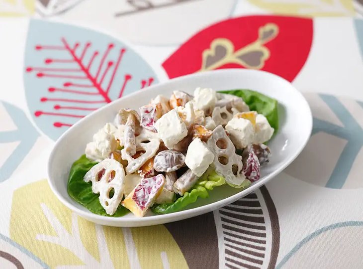 3.ボウルにマヨネーズとヨーグルトを入れて混ぜ、ひと口大に切ったキリと②を加えてあえる。サラダ菜とともに盛り付ける。