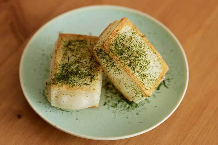 少し多めの油で焼くことで周りはさくっと、中はもちもち食感! のり塩味は裏切りません。