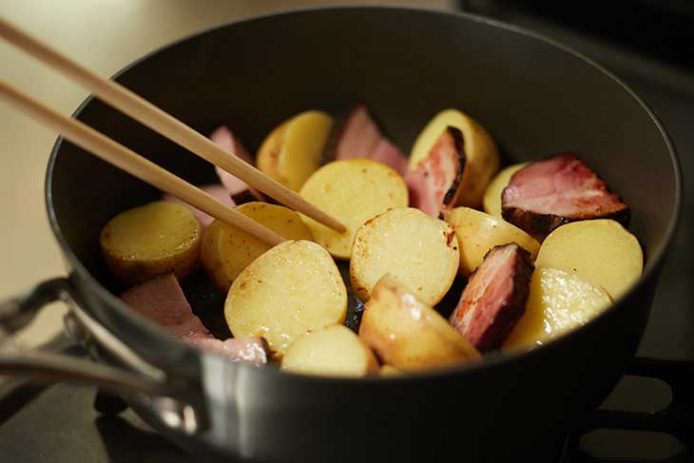 「新じゃがは皮が薄く、香りも楽しめるので皮ごと調理します。ベーコンとカレー粉を組み合わせることでいつもの煮っころがしとは少し違う新じゃがを味わえます。おつまみにもおすすめです!」(料理監修・ウェッティさん)