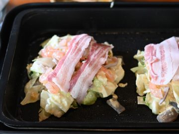 3.生地の上にエビやイカをまぶし、さらに豚バラを何枚かのせて上部を覆う。