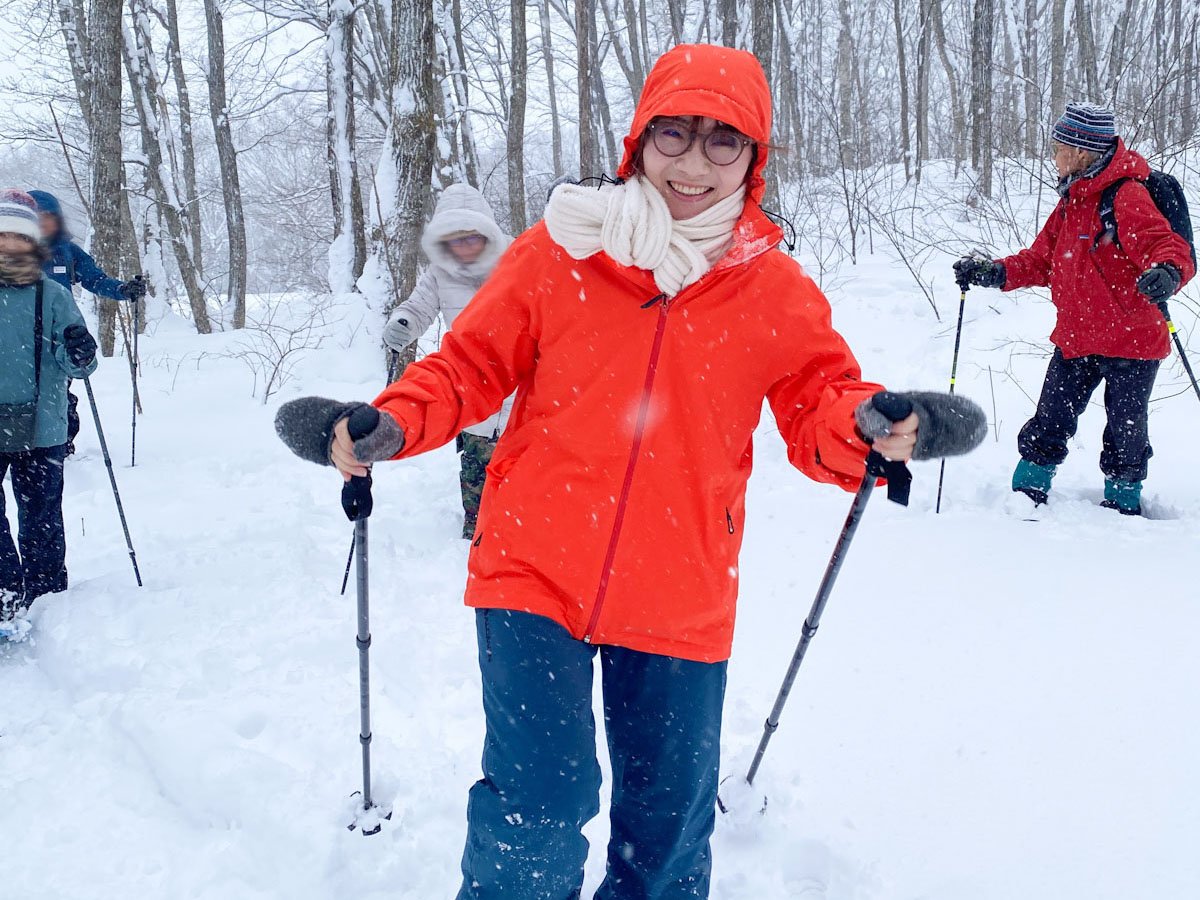 到着すると、そこには一面の銀世界! 最初に体験したのは、スノーシュートレッキング。ふわふわのパウダースノーの上を、専用のスノーシューを履いて歩くアクティビティです。雫石の雪は水分量が少なく、“しずパウ”と呼ばれるほど軽やか。その雪を踏みしめながら森の中を進む時間は、雪国ならではの静けさと自然の大きさを肌で感じられる体験でした。